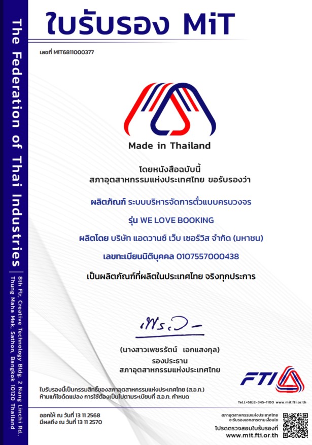 WELOVEBOOKING บริษัทเทคโนโลยีสัญชาติไทยภายใต้การดูแลของบริษัท แอดวานซ์ เว็บ เซอร์วิส จํากัด (มหาชน) ที่มีประสบการณ์การพัฒนาระบบออนไลน์มามากกว่า 15 ปี ให้กับธุรกิจกว่า 100 รายทั่วประเทศไทย การันตีด้วยรางวัลรองชนะเลิศประเภท Business Service จาก Thailand ICT Awards 2018 พร้อมส่งมอบโซลูชันทางธุรกิจด้วยบริการที่เป็นเลิศตามค่านิยมหลักขององค์กร